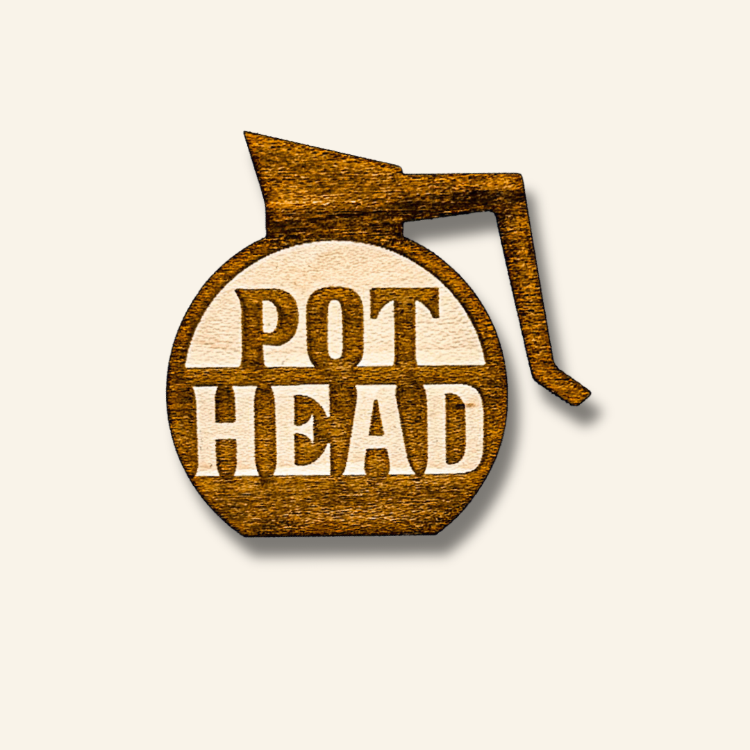 Show off your love for coffee with this laser-etched maple wood sticker, shaped like a classic coffee pot with the playful phrase "Pot Head" nestled inside. Crafted from real maple veneer, it's lightweight, durable, and eco-friendly, featuring a strong adhesive backing.